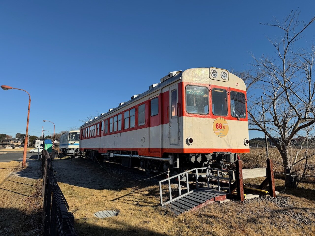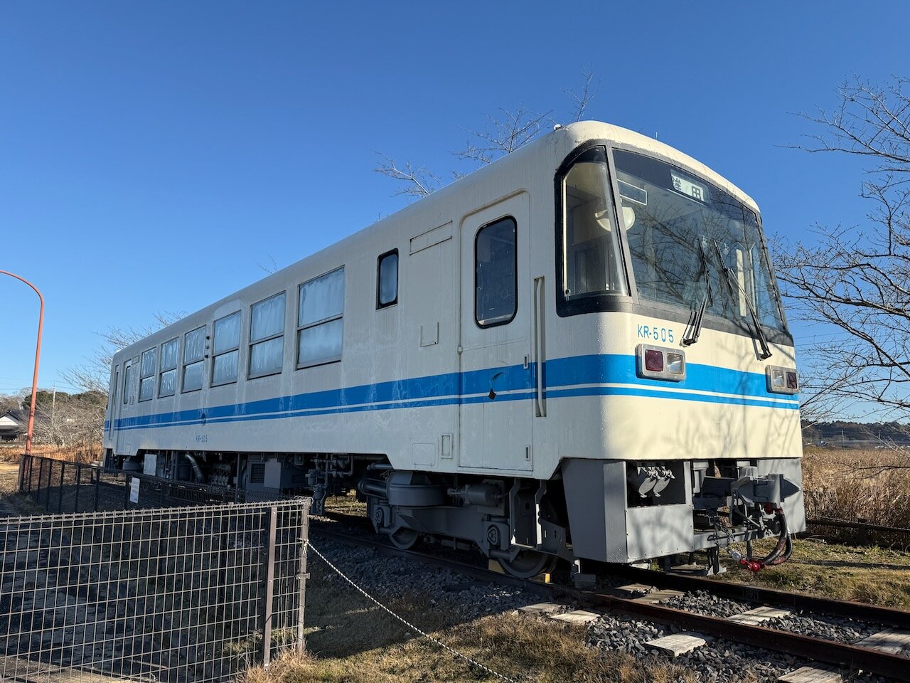 白にブルーの車体はKR-500型のKR-505、鹿島鉄道のオリジナル車です。