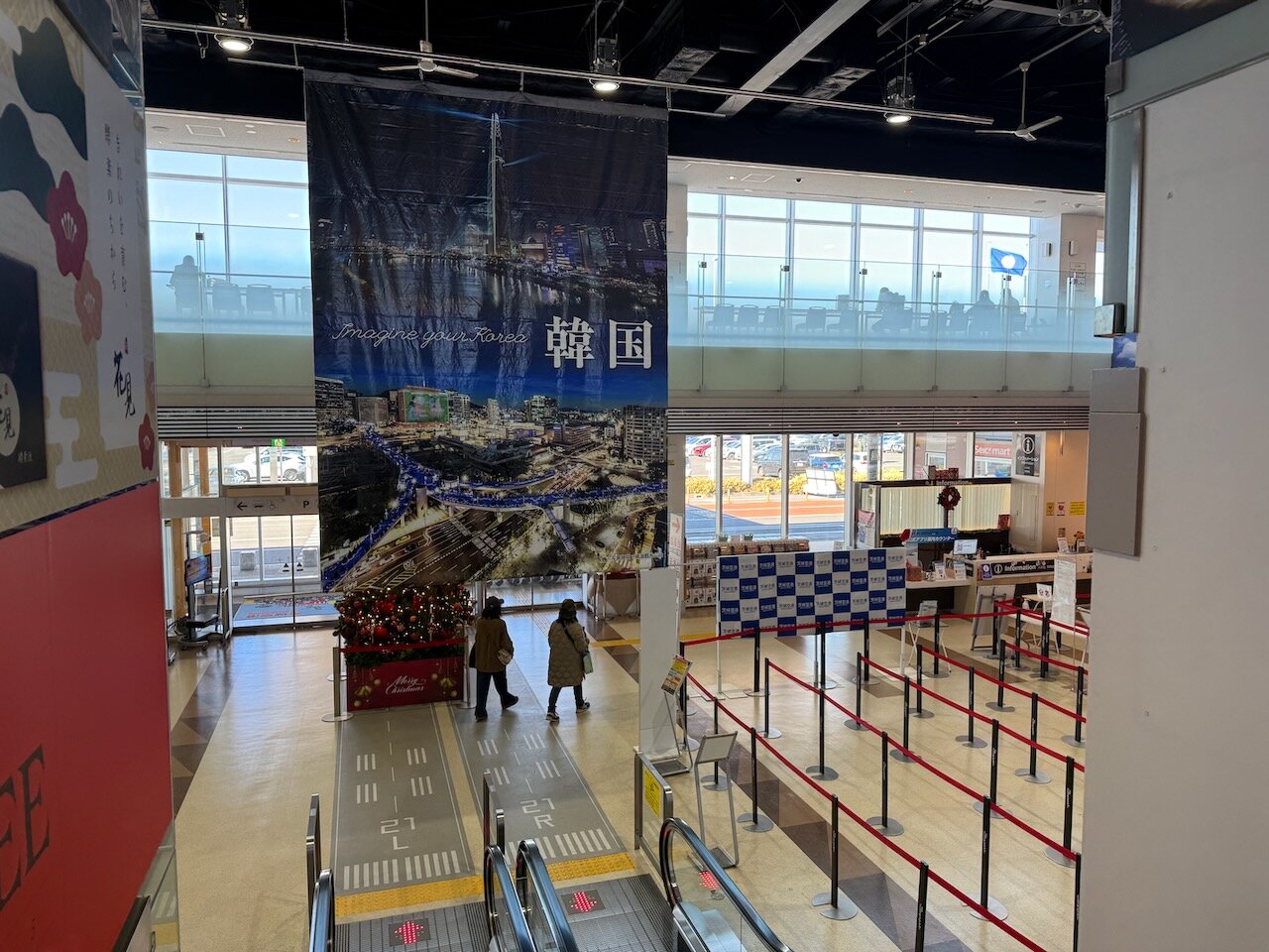 ターミナルは2階建てで、到着出発ともに1階にあり、2階はデッキや商業施設になっています。