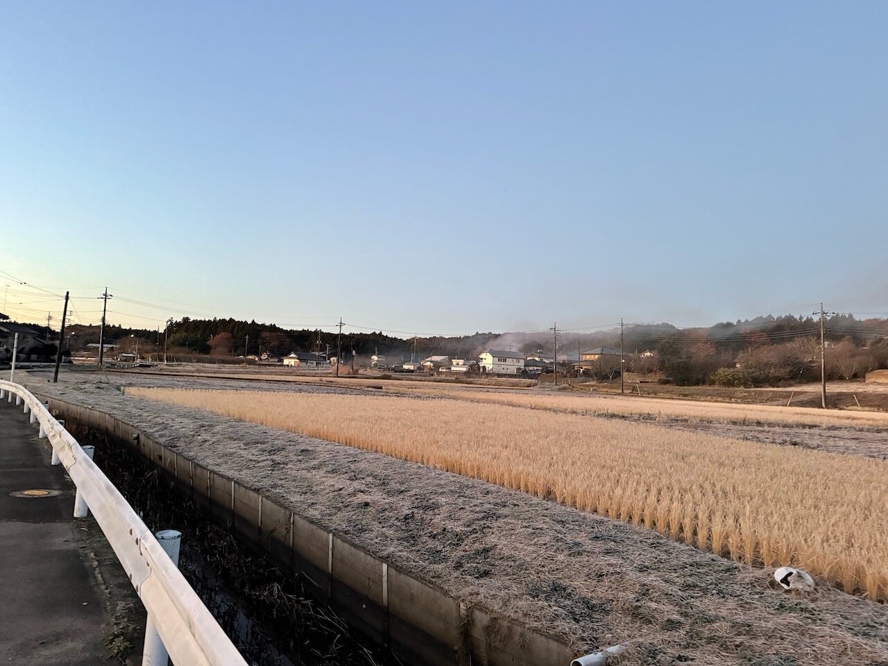 刈り取られた田んぼも、一面に霜が降りて真っ白に化粧しています。