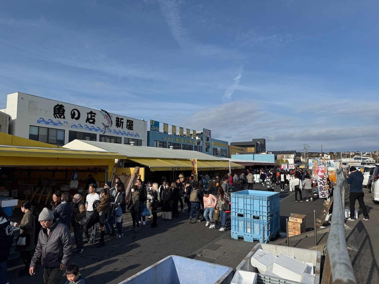 磯の香りがたっぷり立ち込める中、屋台の焼き物や雪箱に入った魚介が入り乱れます。