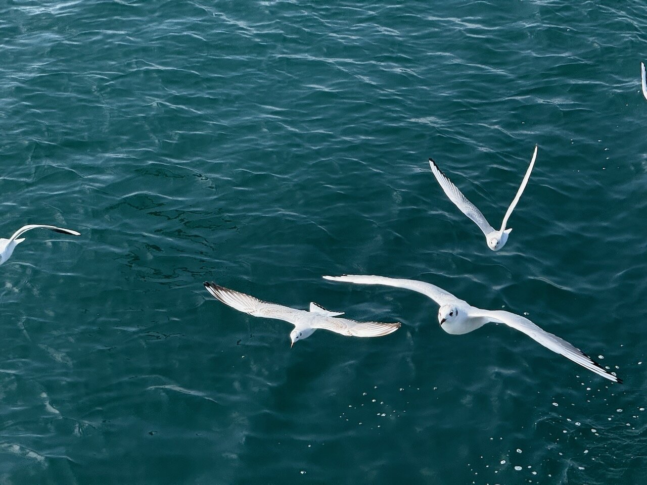 ユリカモメは20〜30羽ほどが船に寄り添って湾を往復しながら餌をねだります。