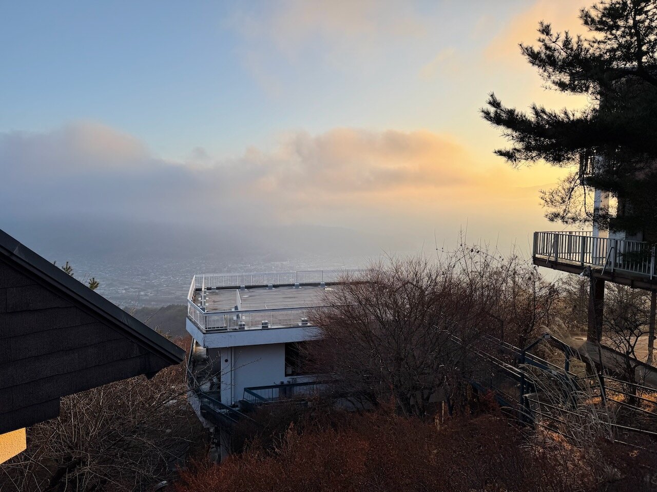 展望台の外からでも斜めから朝日が差し込みはじめて、茅野の市街地がどんどん明るくなっている様子は伺えます。