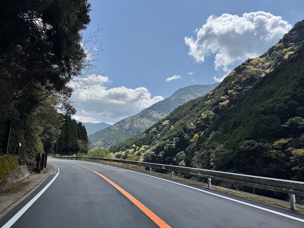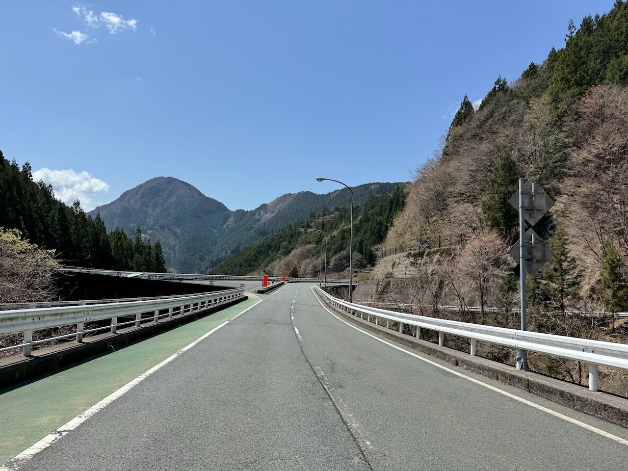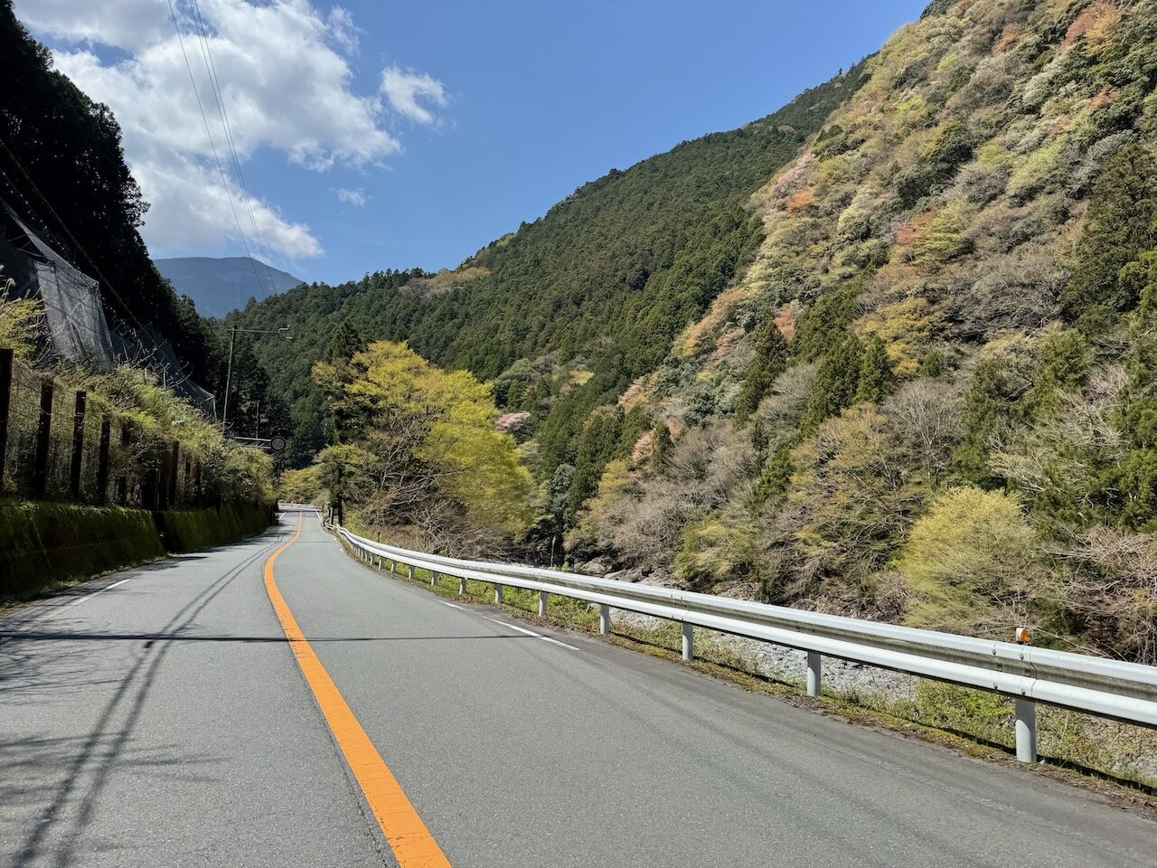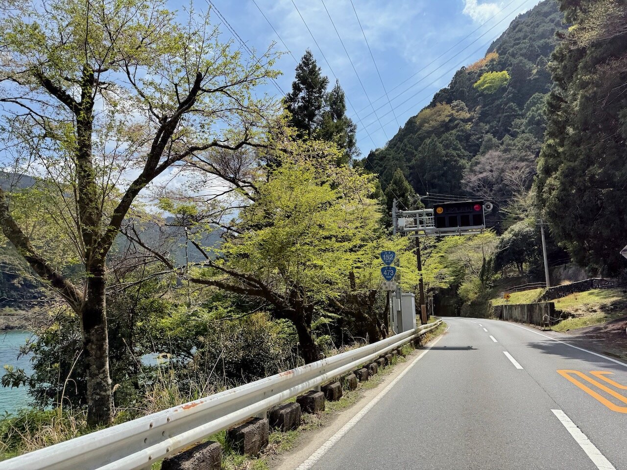 国道152号に戻って、新芽の芽吹いた山肌を眺めつつ南下。