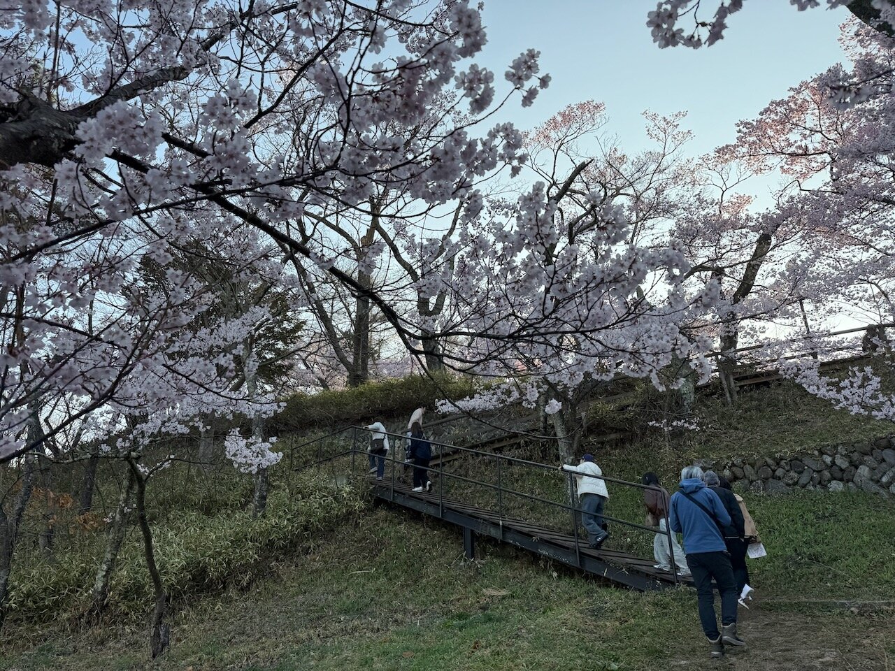 朝日が昇るのに合わせるように、城の施設跡を登りながらさくらを眺めます。