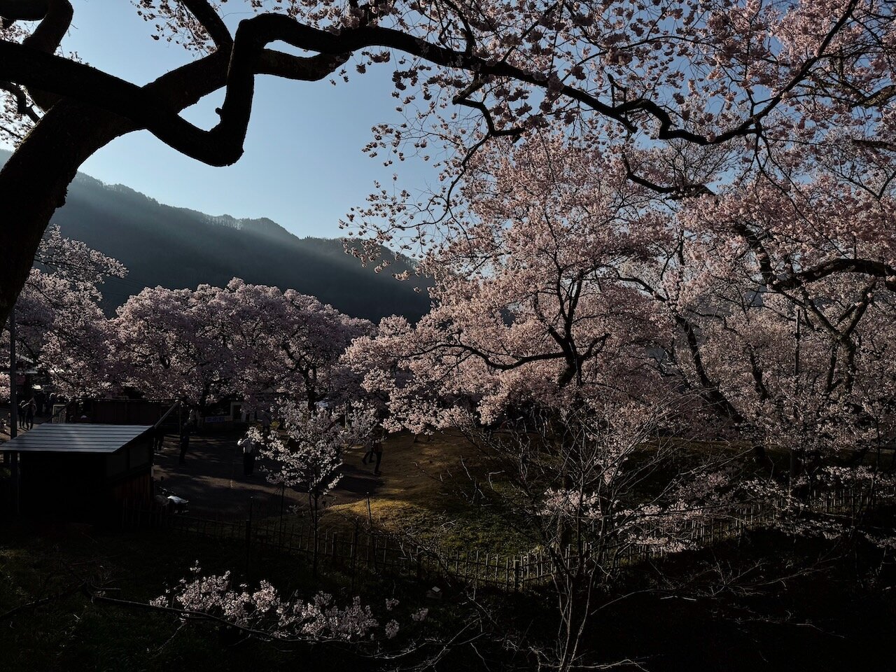 電子チケットでゲートをくぐる頃、時間は6:45をまわり、稜線越しの日光がちょうど桜にあたりはじめました。