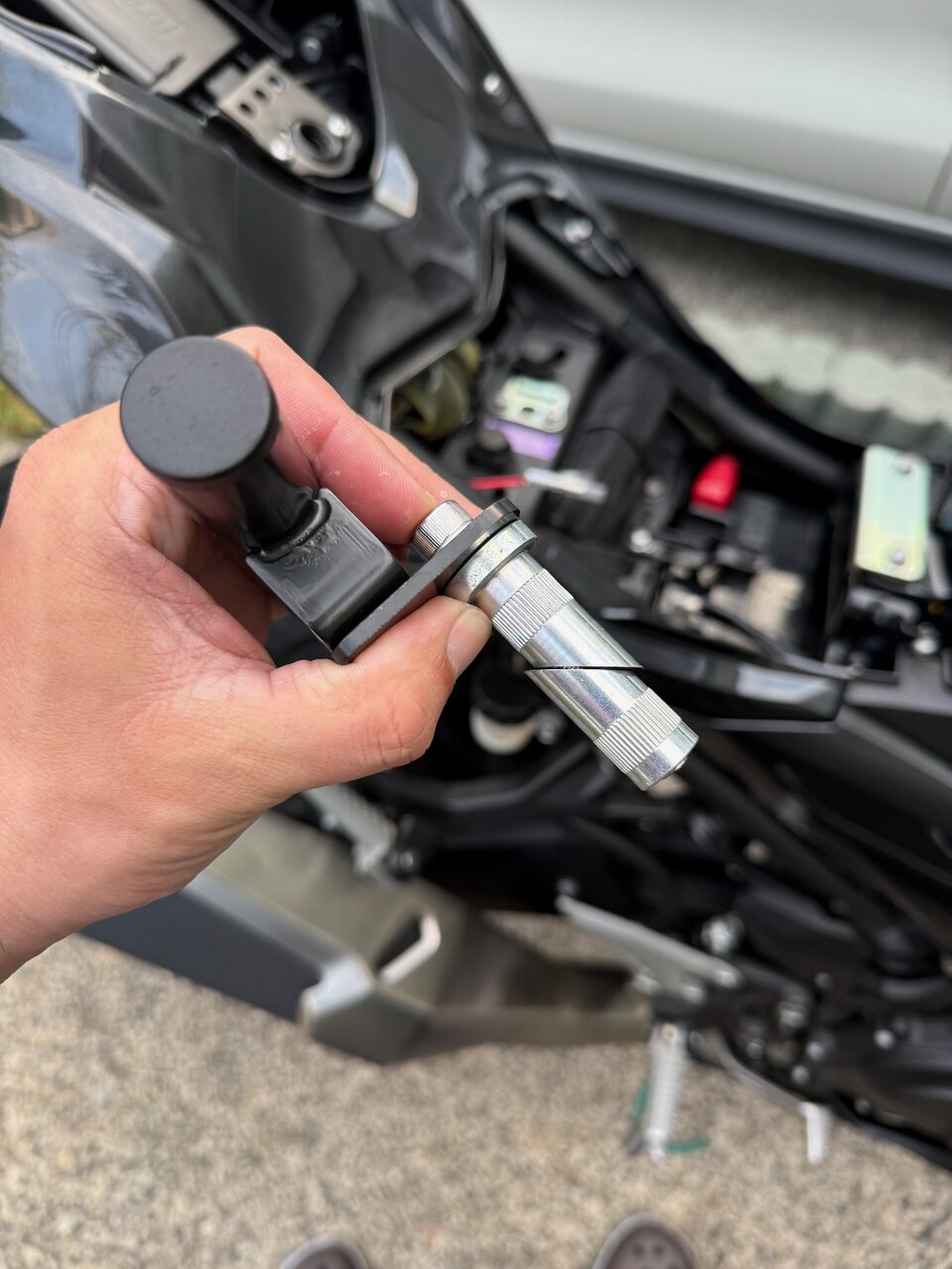 ただ、イグニッションキーが触りづらくなるのがいやだったので、タンク側に寄るように取り付けなおしました。