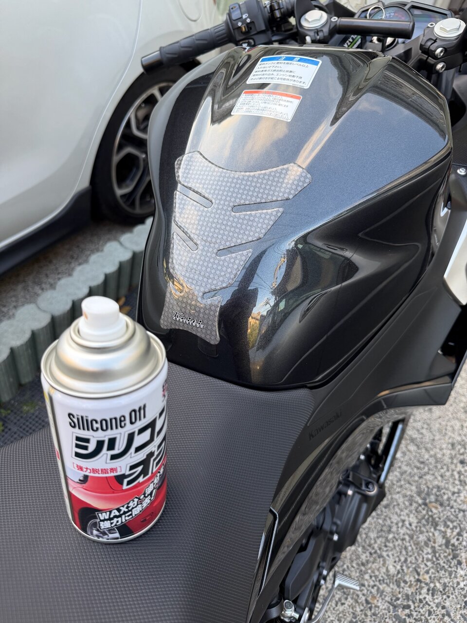 タンクがファスナー金具などで傷つかないようにタンクパッドを貼ります。