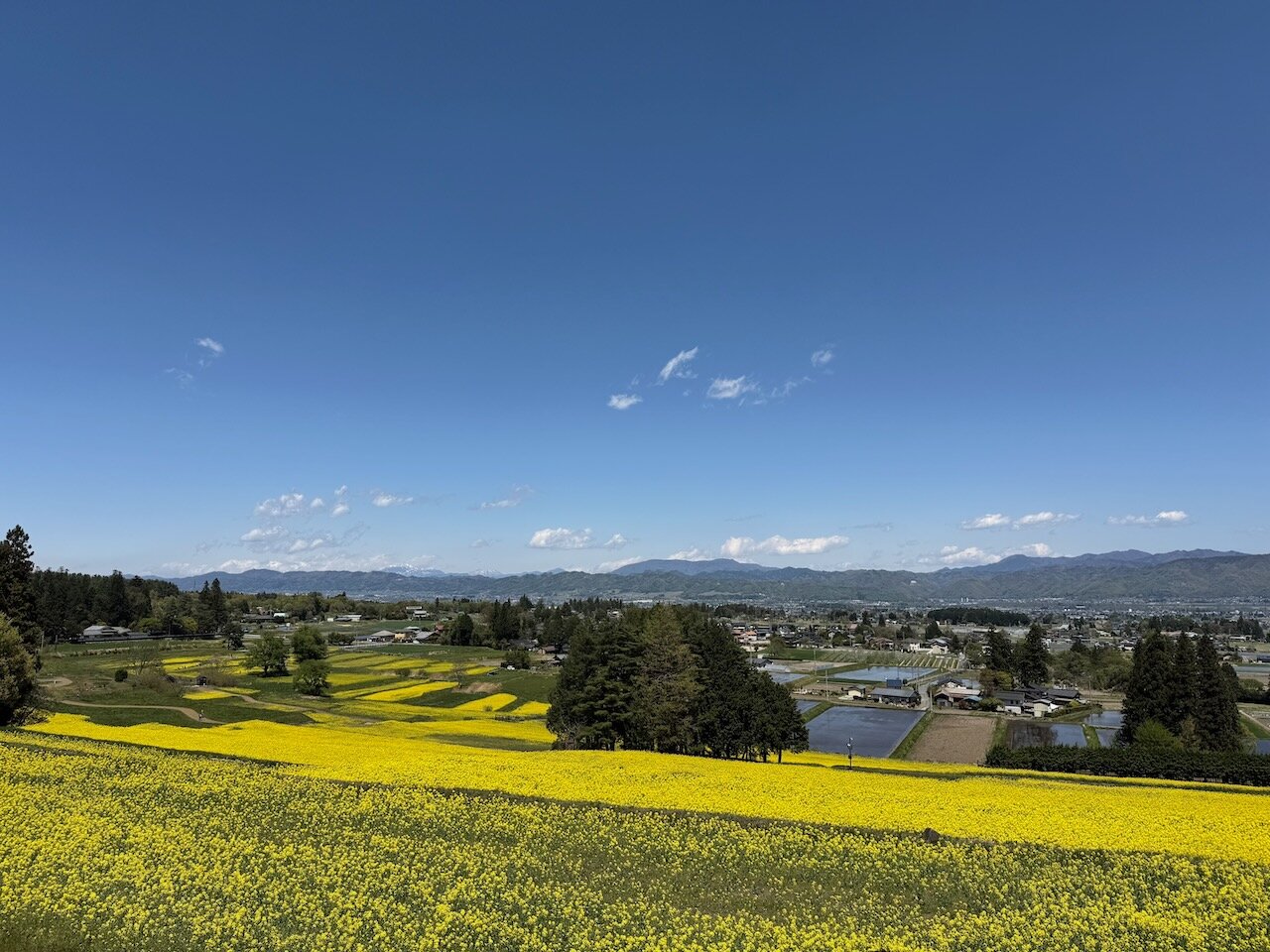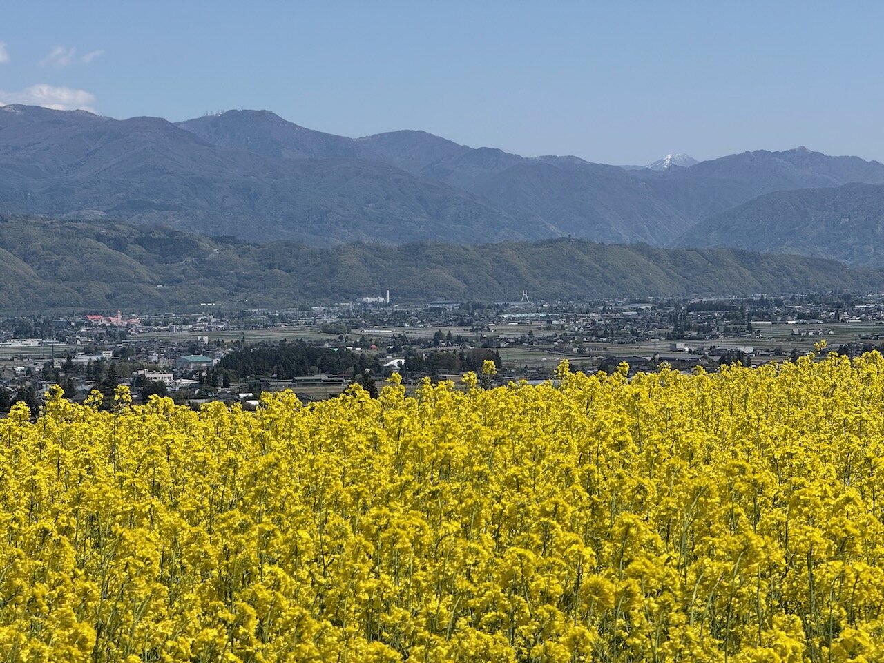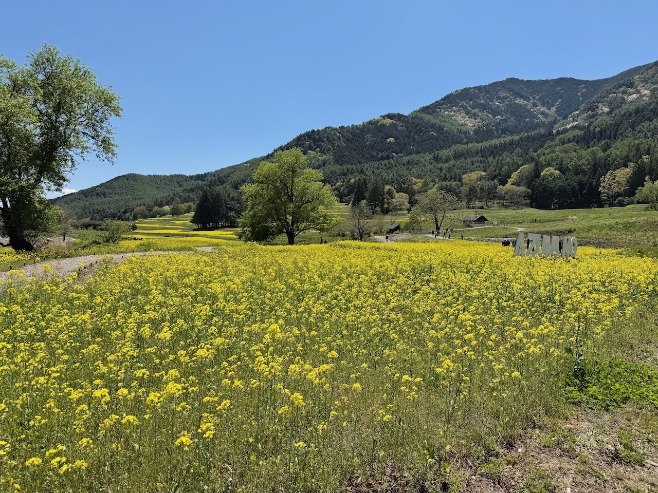 段々畑には遊歩道が整備されているので、上まで歩いて登っていくと、盆地を一望しつつ黄色の絨毯を眼下に大きく見ることができます。