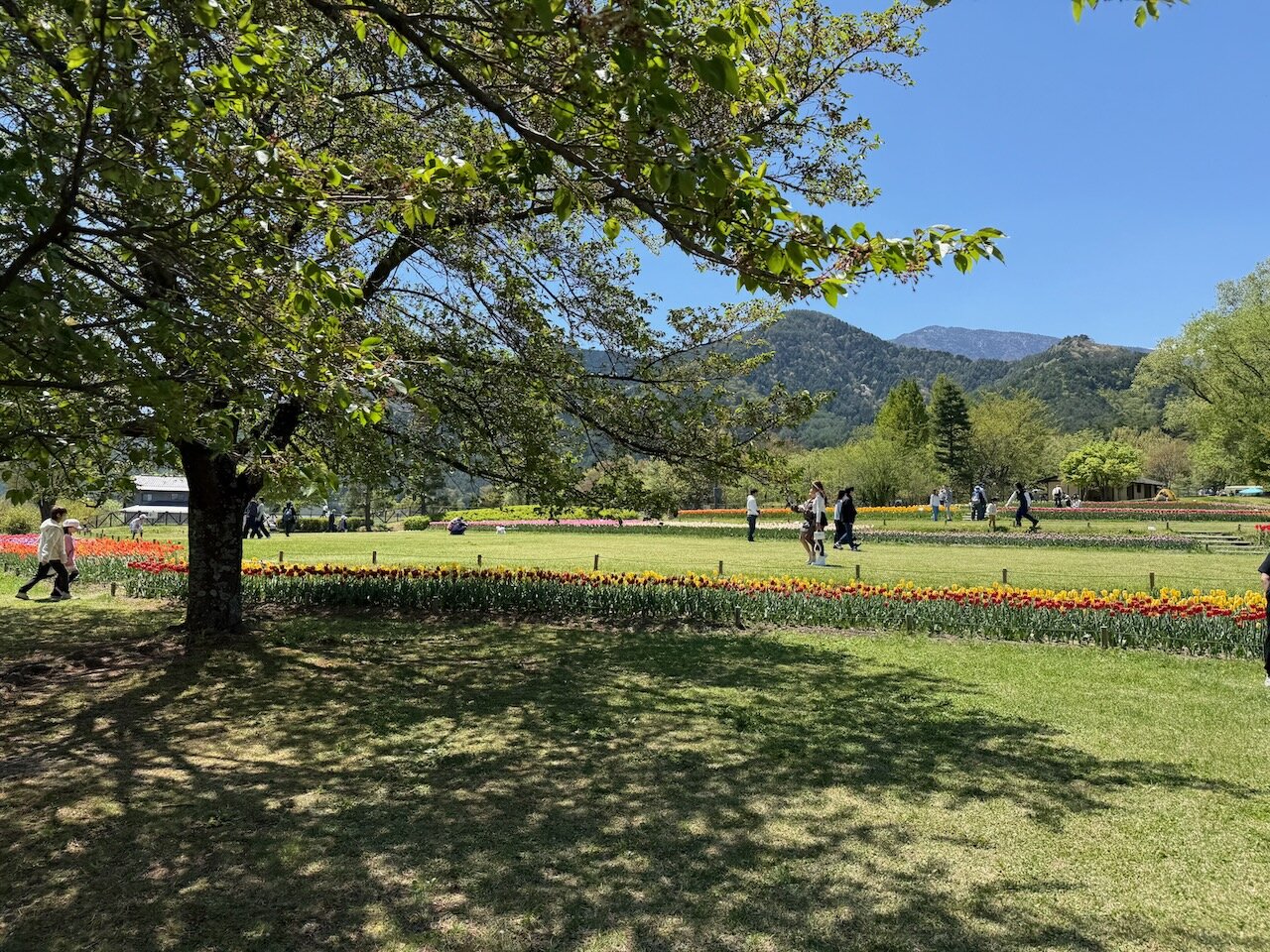 彩り鮮やかなチューリップは、芝生を挟んで散発的に植えられている場所もあり・・・