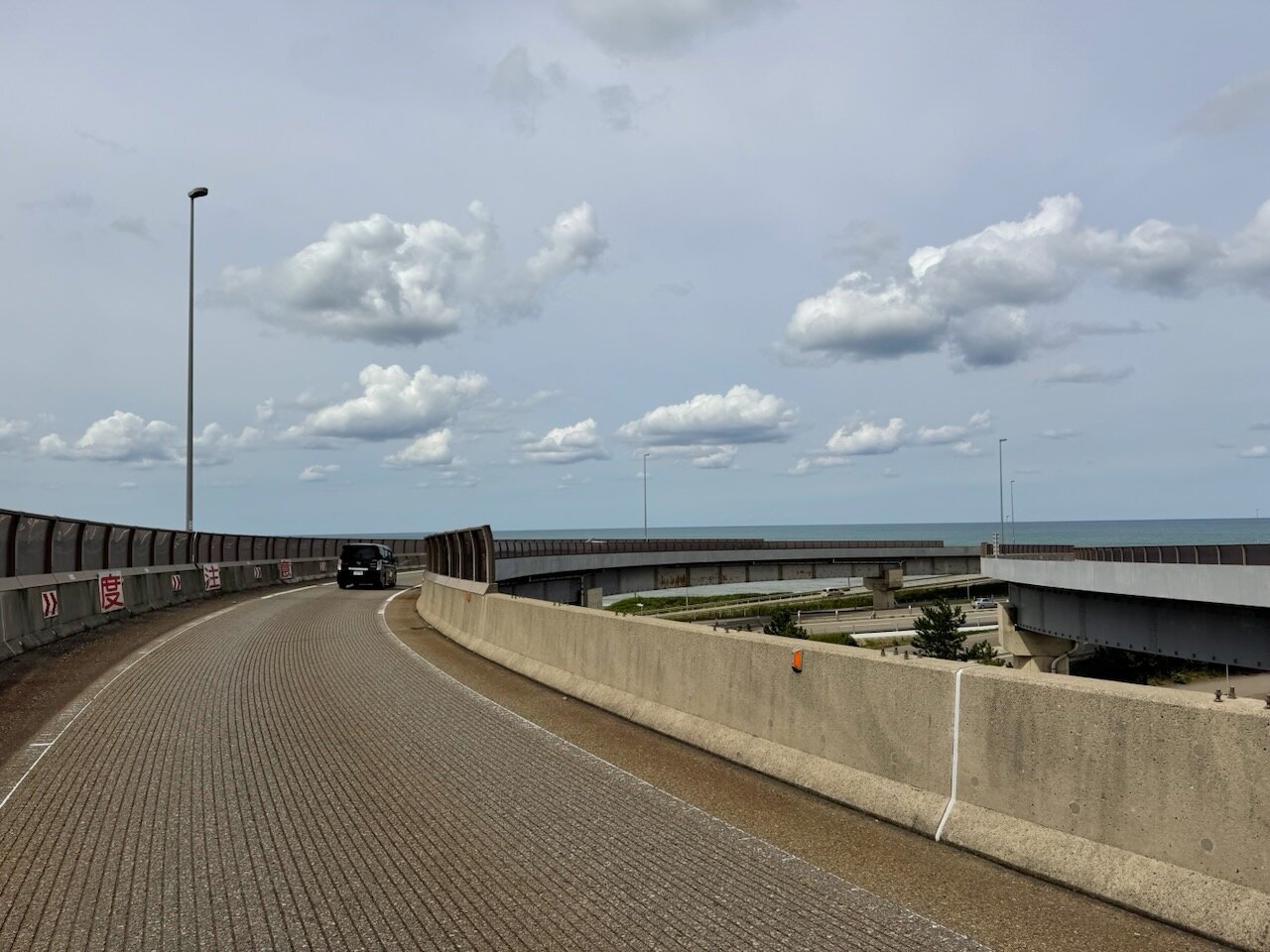 海王丸パークから新湊大橋を越え、富山新港を東へまたぎます。