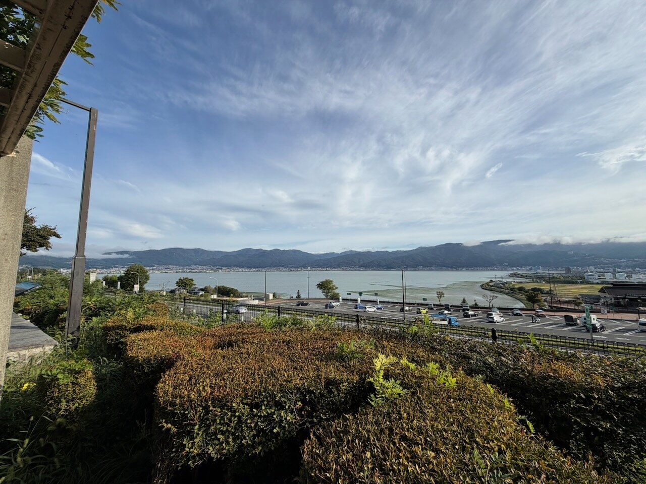 対岸の山々の稜線が曇りなく見え、まさにこれぞ諏訪湖の眺望といった感。