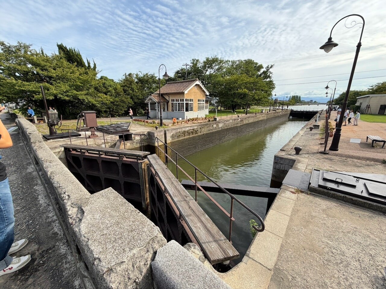 ここは神通川の河口付近に開削されている富岩運河の一部として、1934年に建設された、海と運河の水位差を船で行き来するための水門施設です。