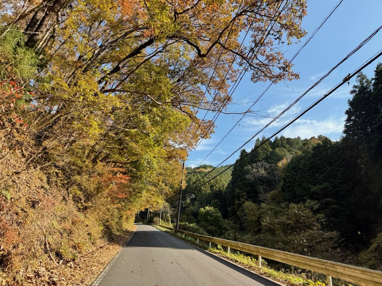 県境に向かって少し山間に入っていくと、ちょうど見頃に差し掛かった紅葉が目に映ります。