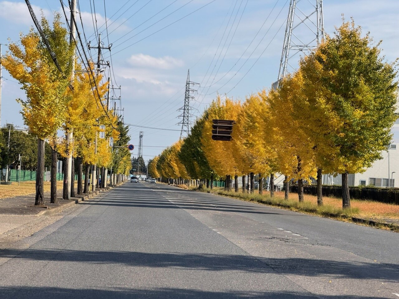 植樹された銀杏が不揃いながらも色づいていて、とても綺麗だったので圧縮効果を期待してズームで一枚。