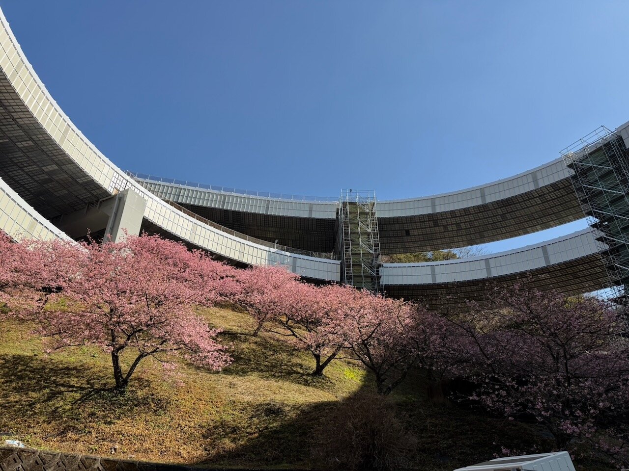 らせん状の橋のカーブと斜面の桜の対比が美しいですね。