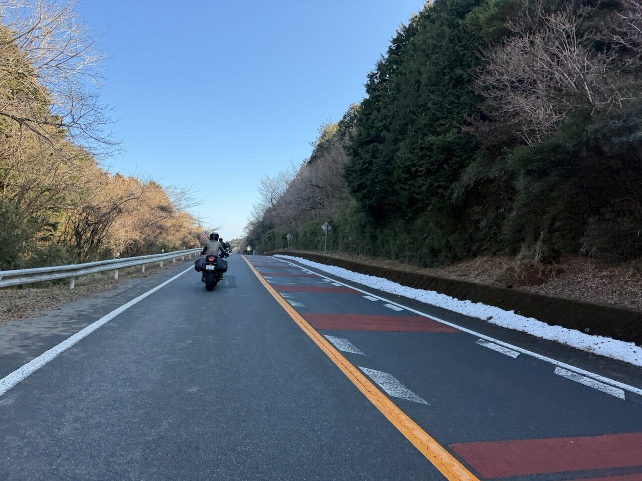 標高が高くて斜面の影になるところは、まだ路肩に雪が残っていましたが、走行路自体はドライ。